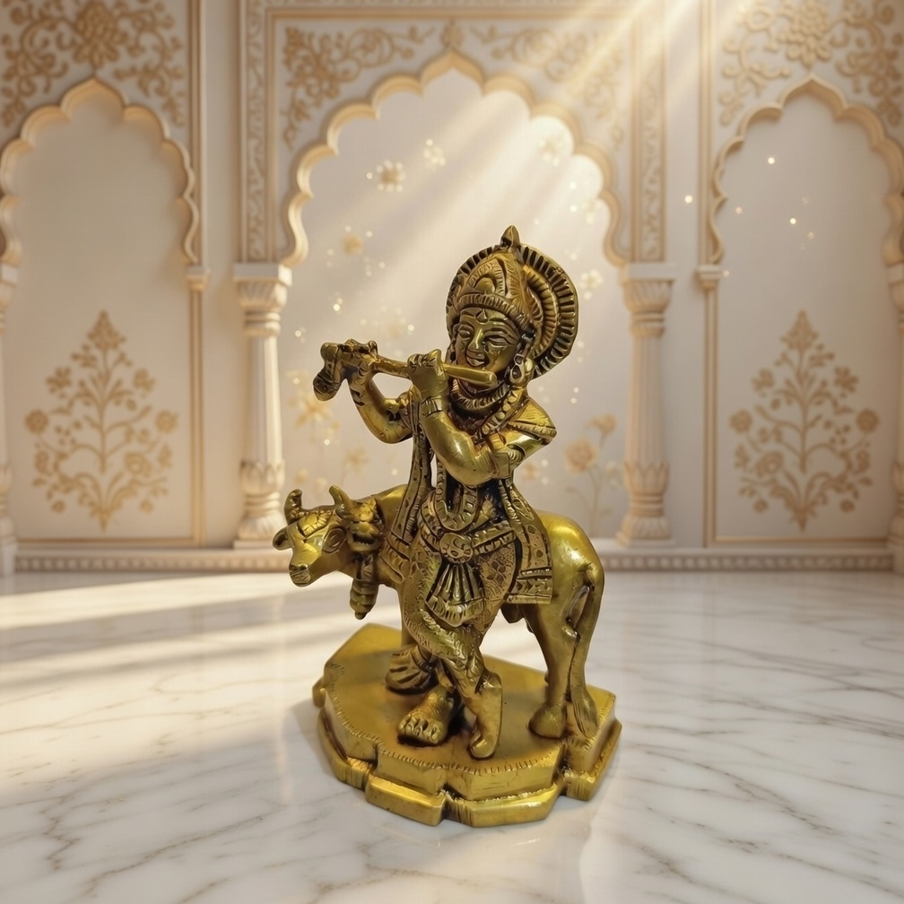 Invite peace, positivity, and devotion into your space with this exquisite Brass Lord Krishna Idol with Cow. Depicting Krishna Ji playing his divine flute alongside the sacred cow, this murti symbolizes love, harmony, protection, and prosperity.