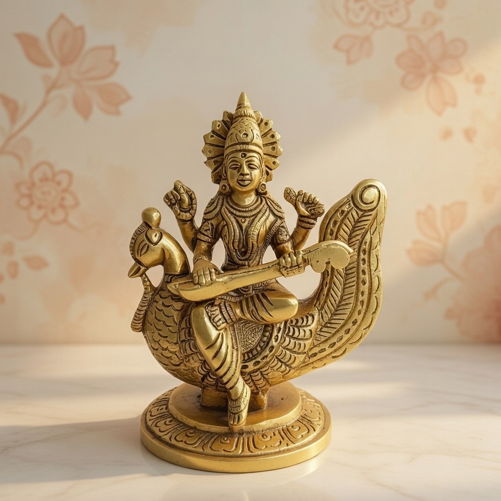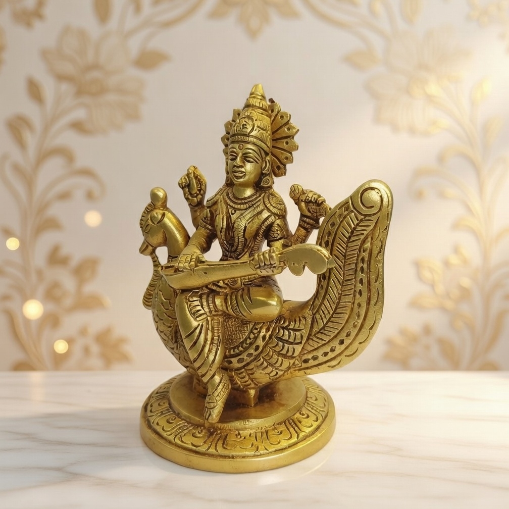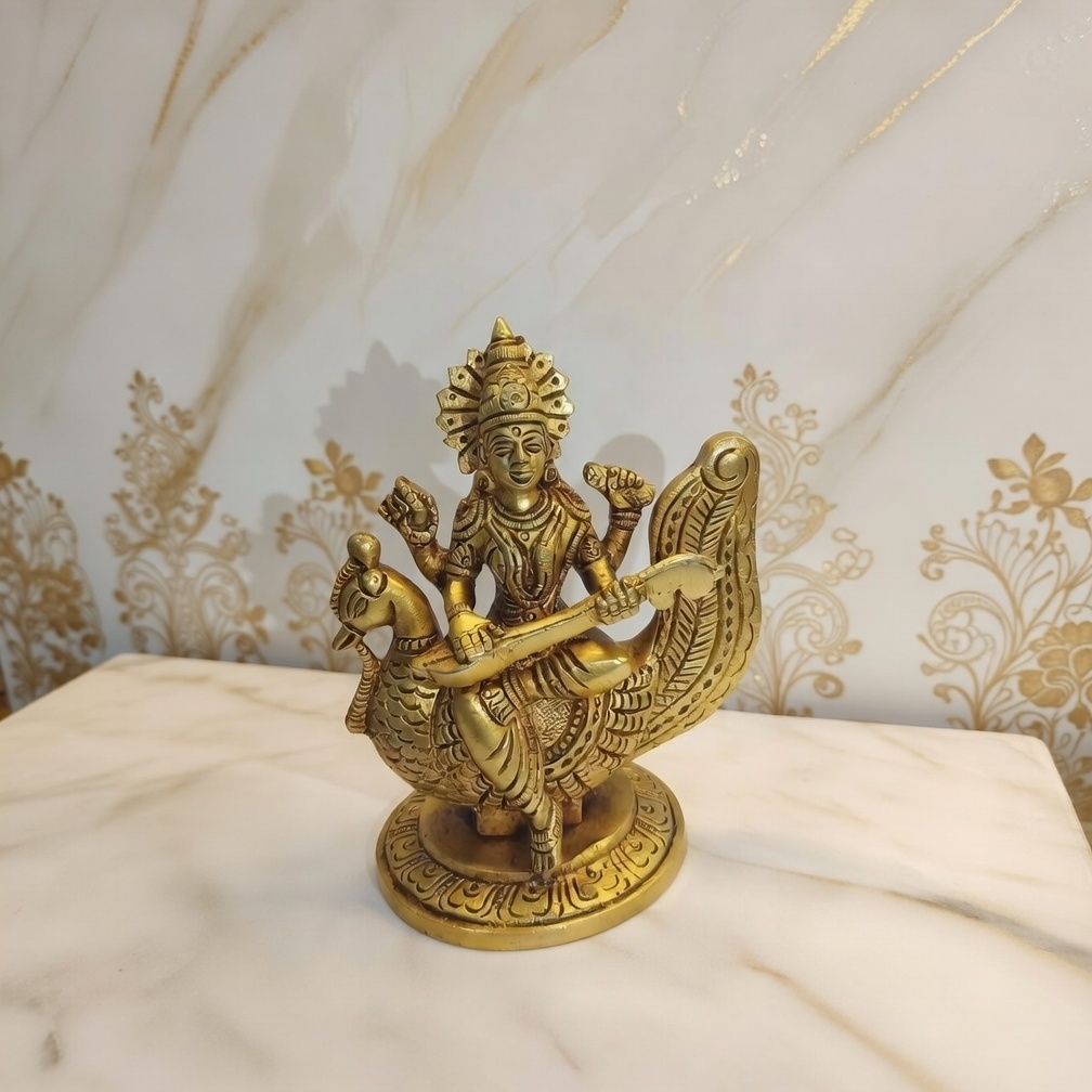 Bring the blessings of wisdom and learning into your home with this elegant Brass Goddess Saraswati Idol. Maa Saraswati, the goddess of knowledge, music, arts, and education, is beautifully depicted seated on her sacred swan (Hans), holding the veena — symbol of harmony and creativity.